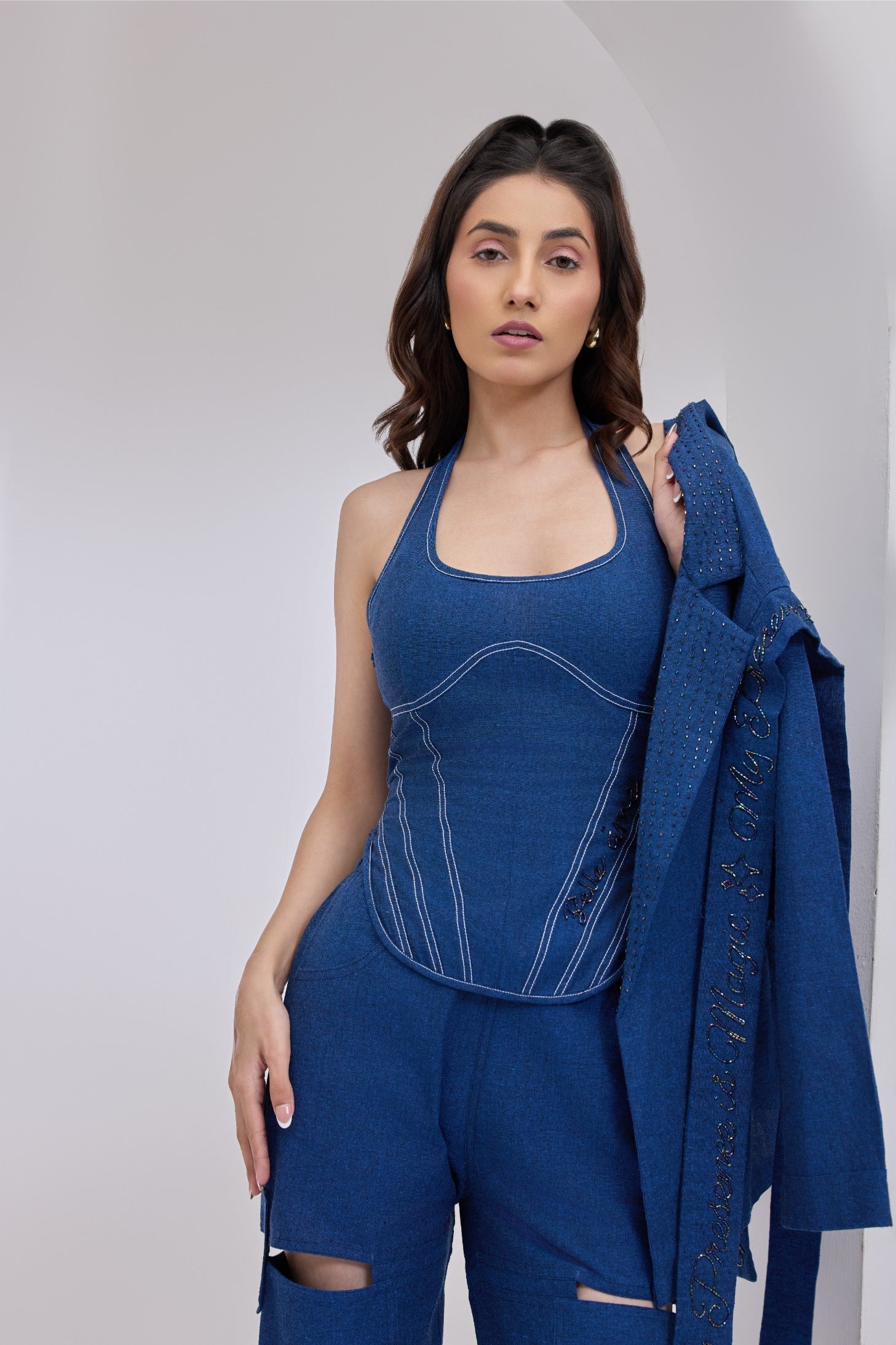 Introducing the Belle aime Denim blue bustier - a captivating fusion of classic style and contemporary flair. Crafted from premium Linen Loom fabric and adorned with delicate hand-embroidered detailing, this bustier is a true work of art.