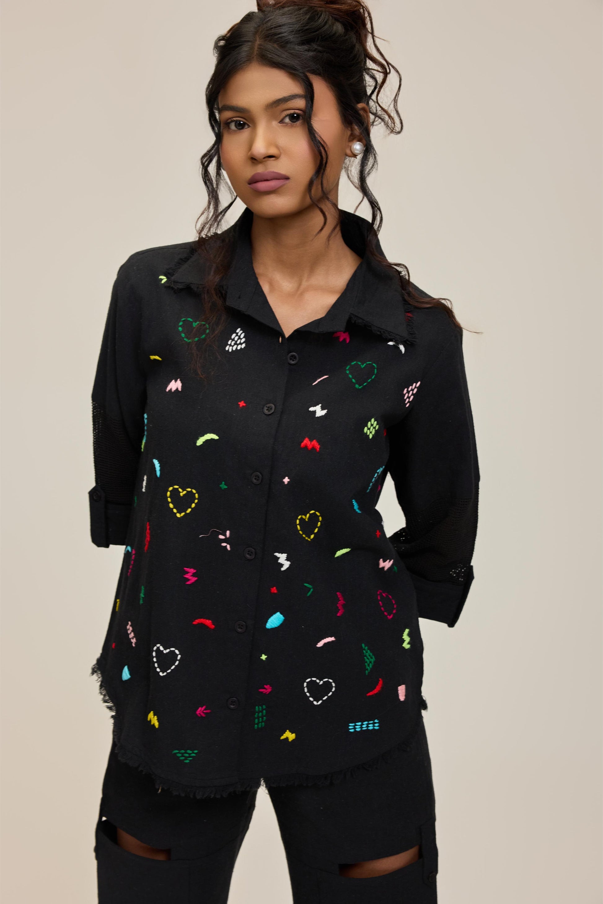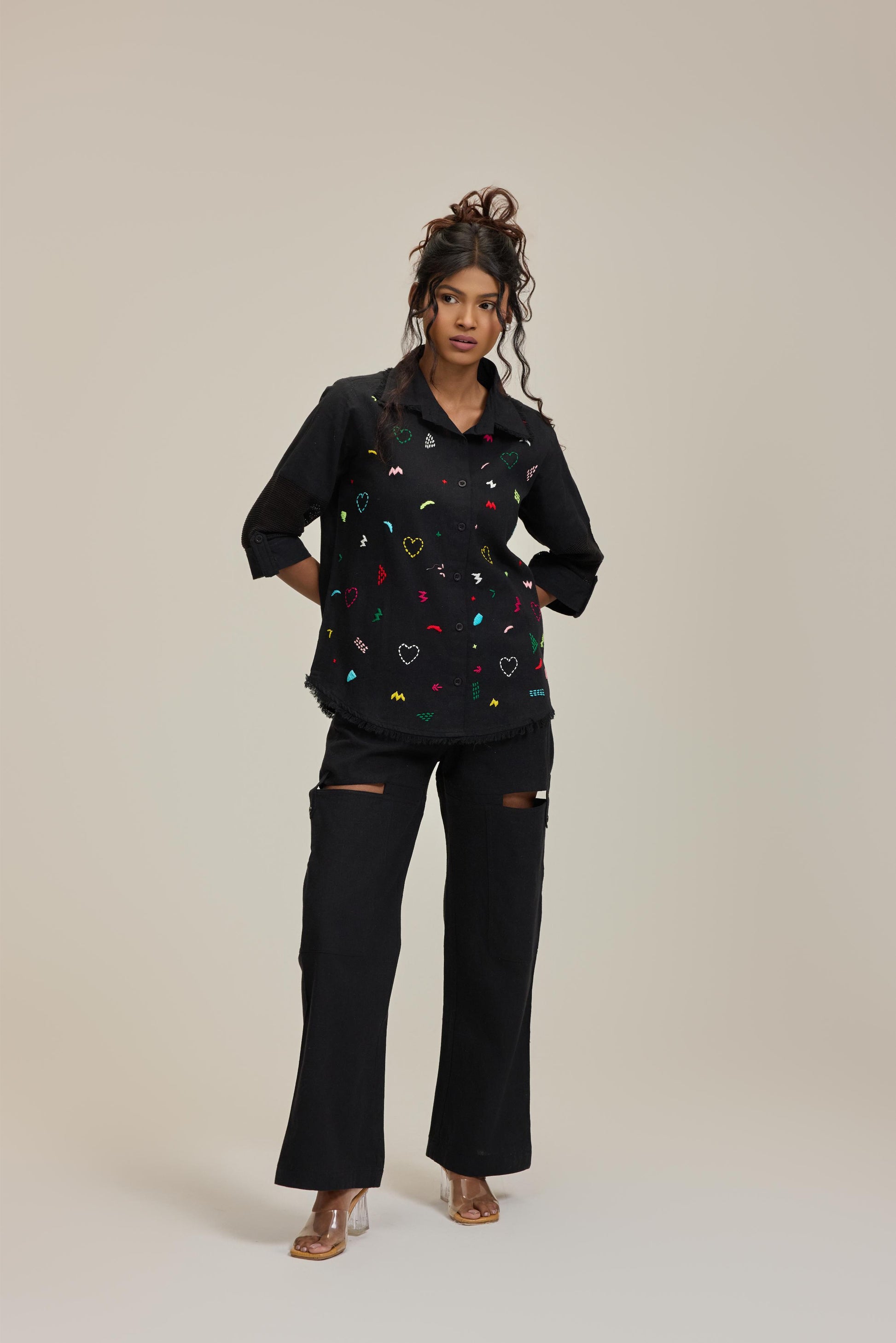 Check out this stylish black Doodle shirt, perfect for adding a unique touch to your wardrobe! Each shirt is hand-embroidered, showcasing intricate designs that make it stand out. It's not just a shirt; it's a statement piece that combines comfort with creativity.