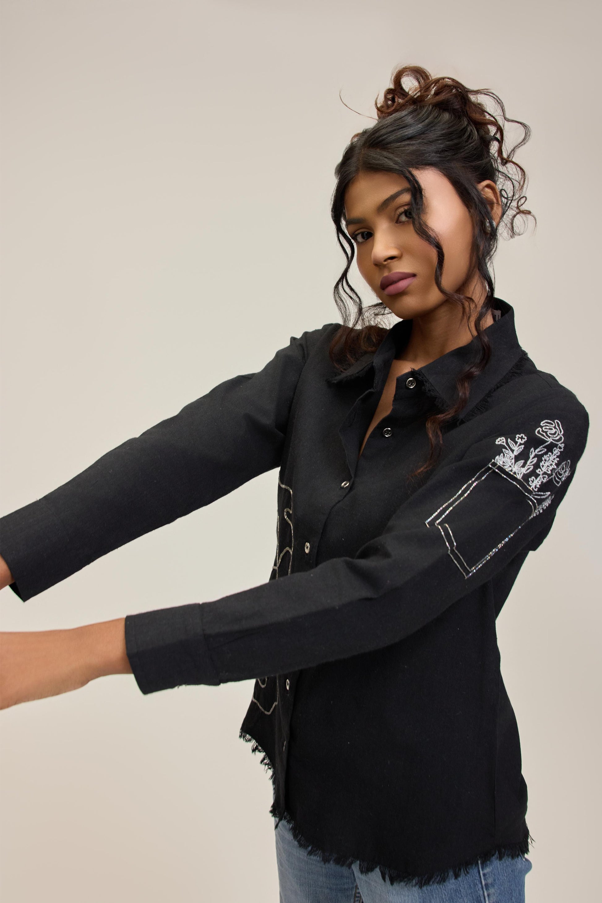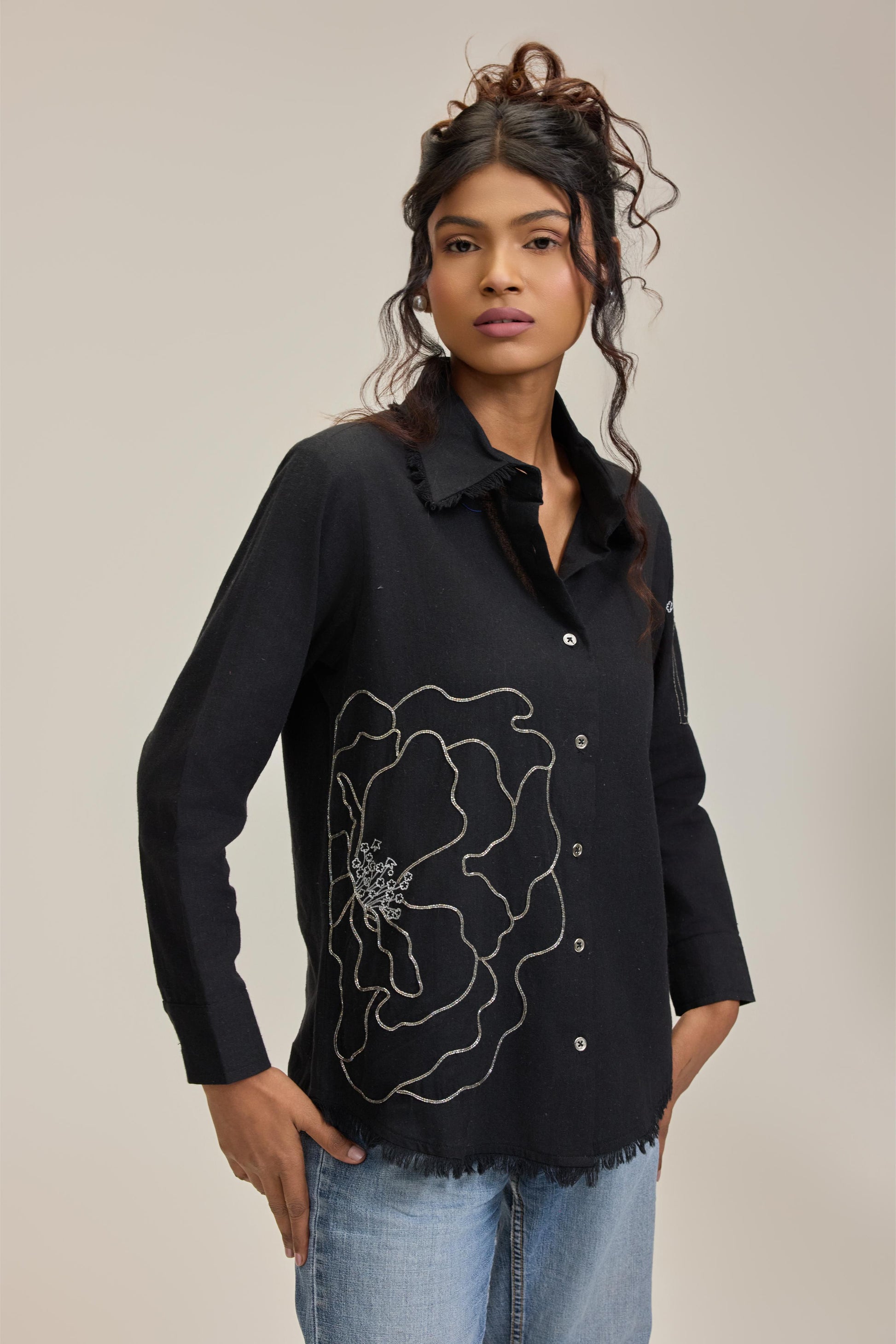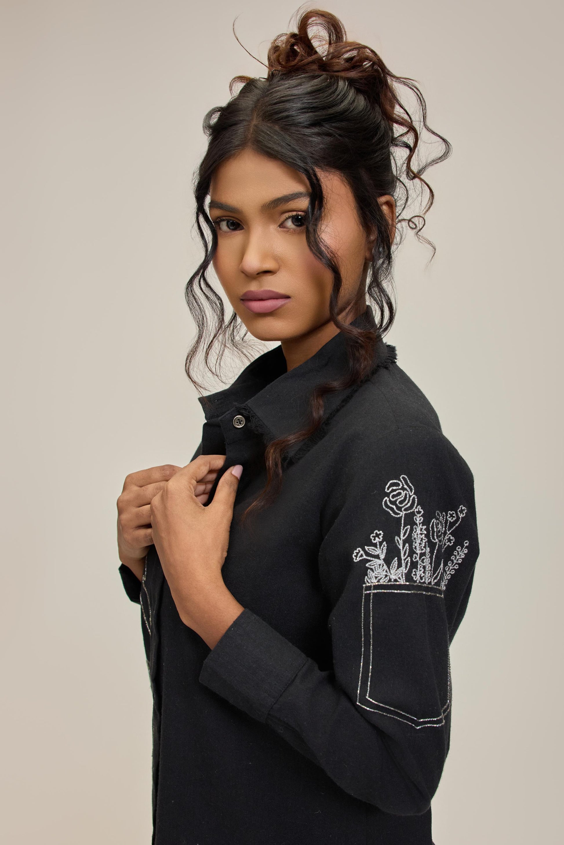 Description - Elevate your wardrobe with this exquisite Black hand-embroidered shirt, a masterpiece of craftsmanship that seamlessly blends elegance and sophistication. Each delicate stitch tells a story of artistry, making it a timeless addition to any discerning fashionista's collection.
