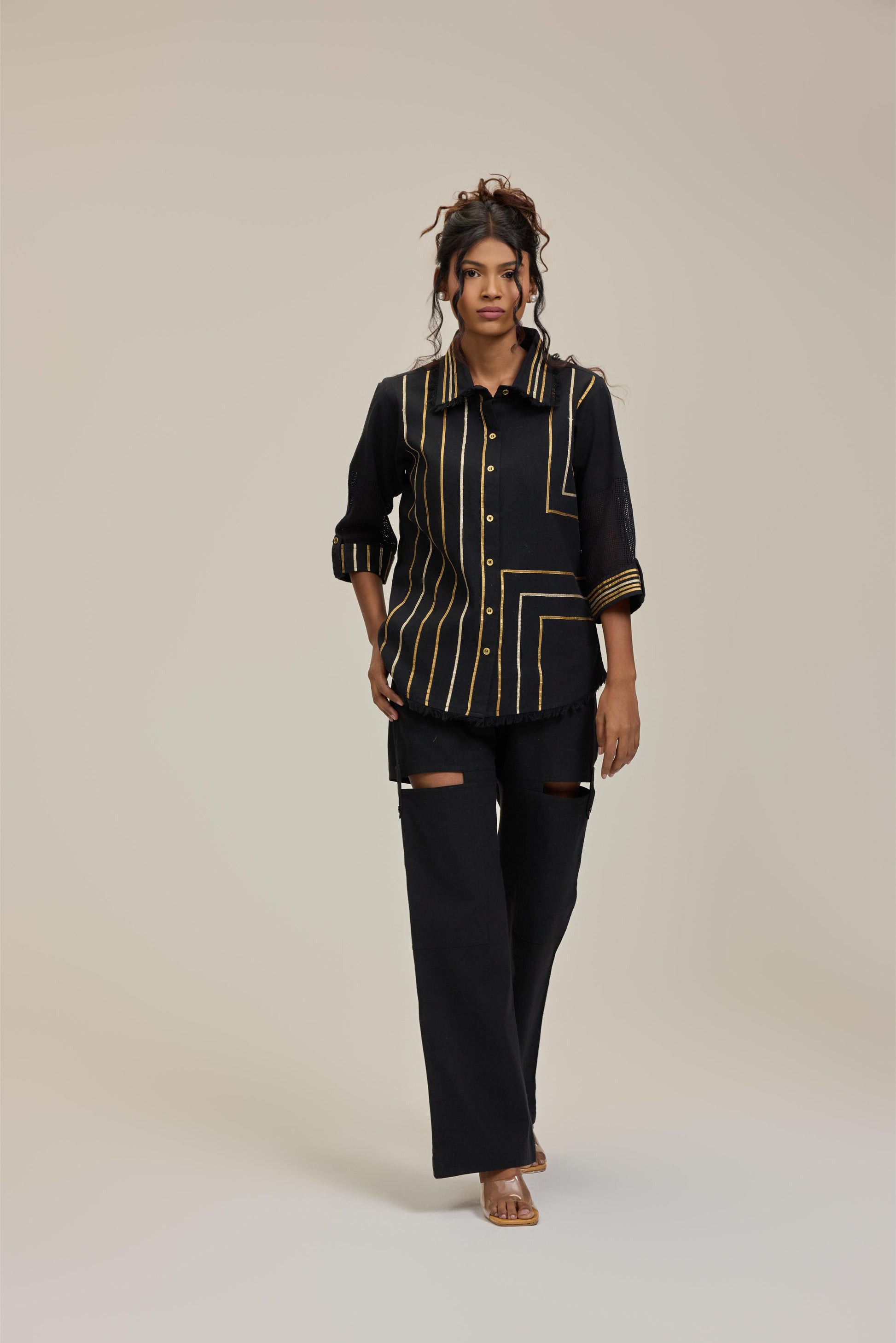 Enhance your wardrobe with this stunning black linen shirt, featuring intricate gotta embroidery that radiates sophistication and allure.