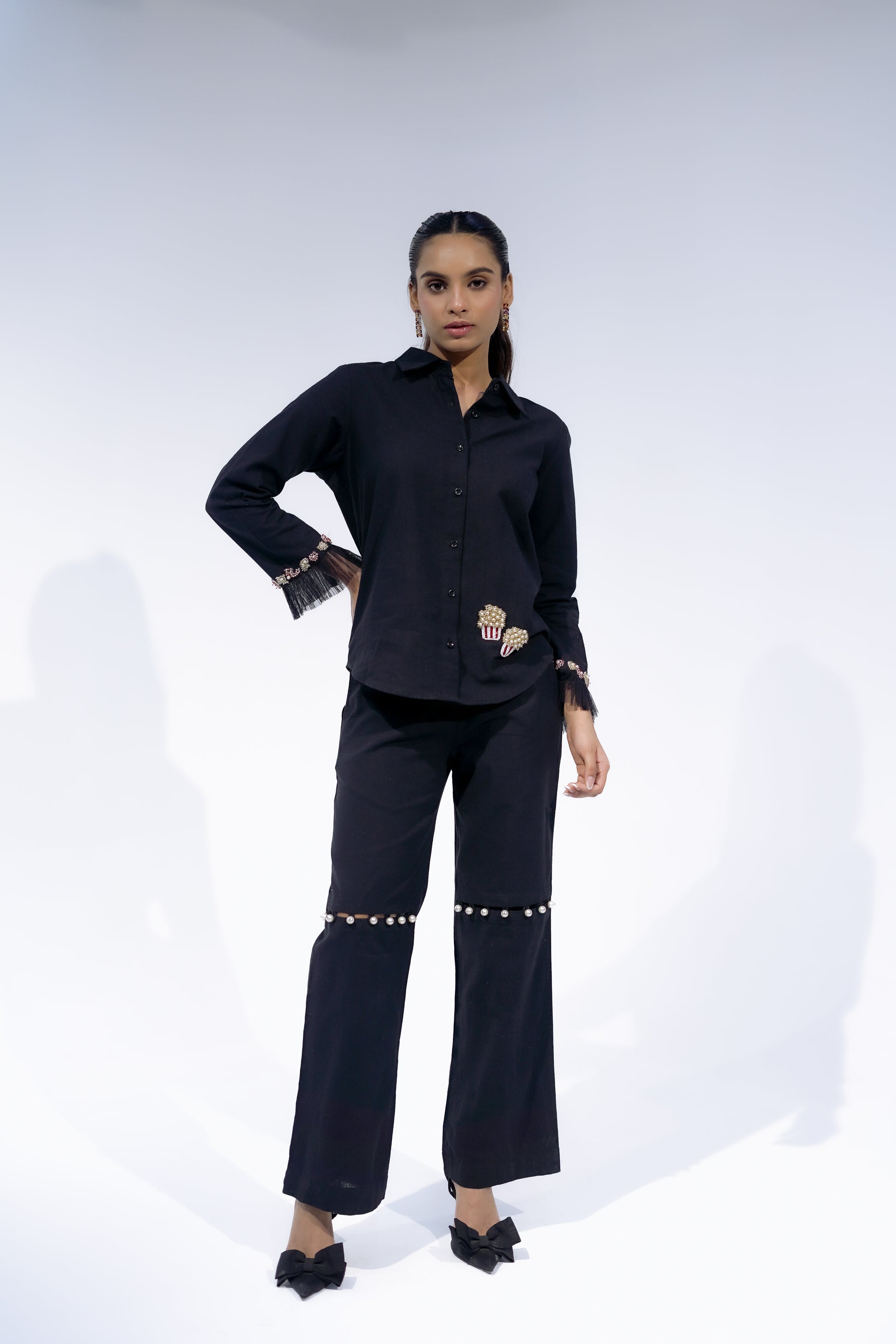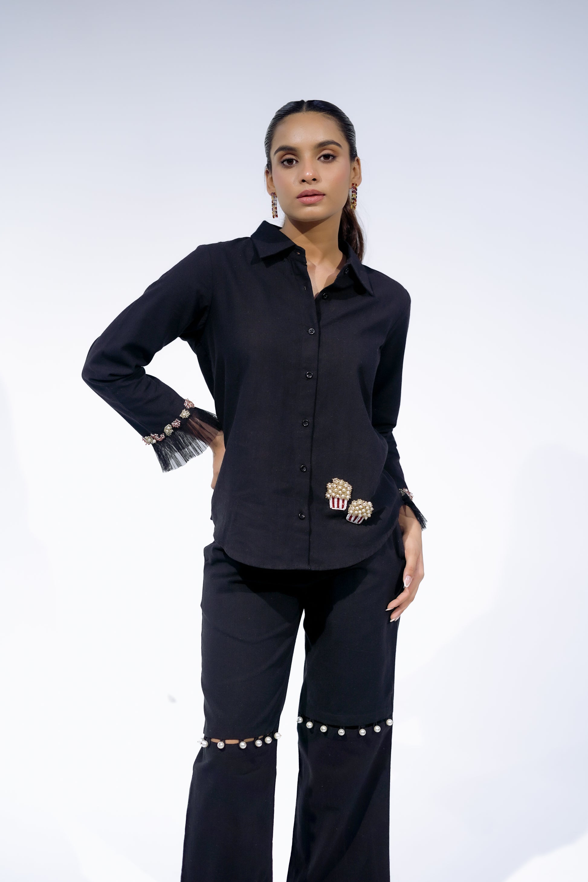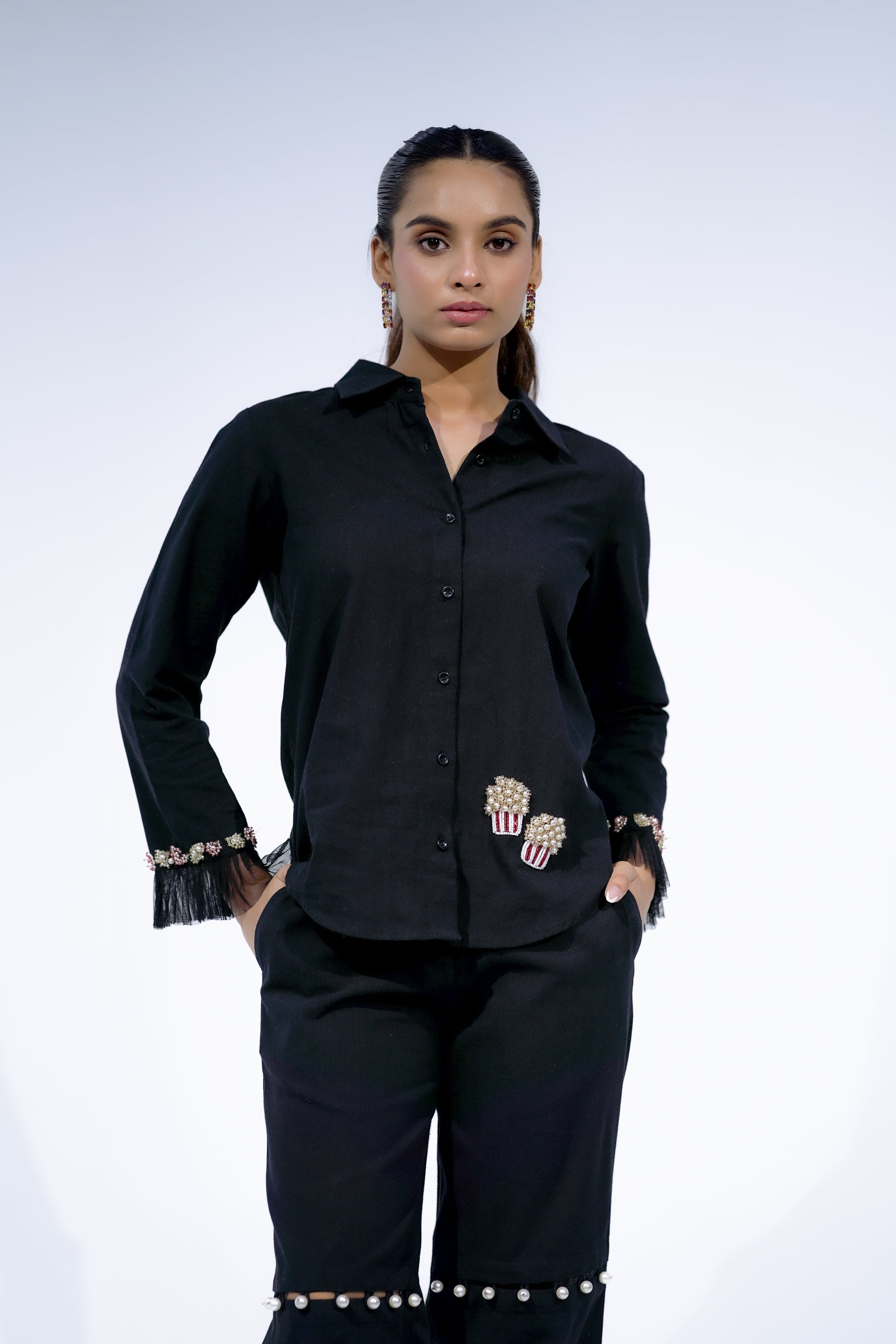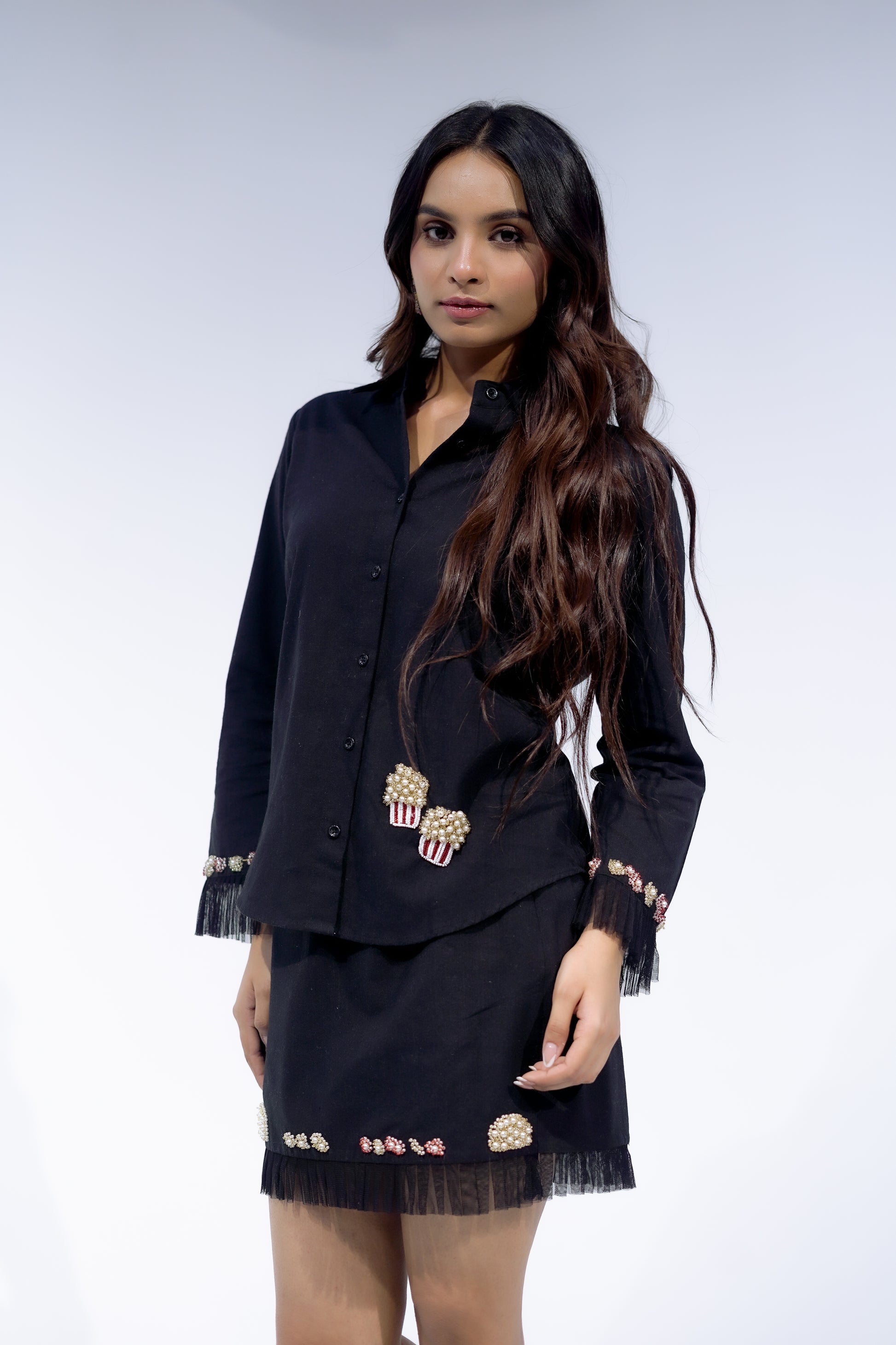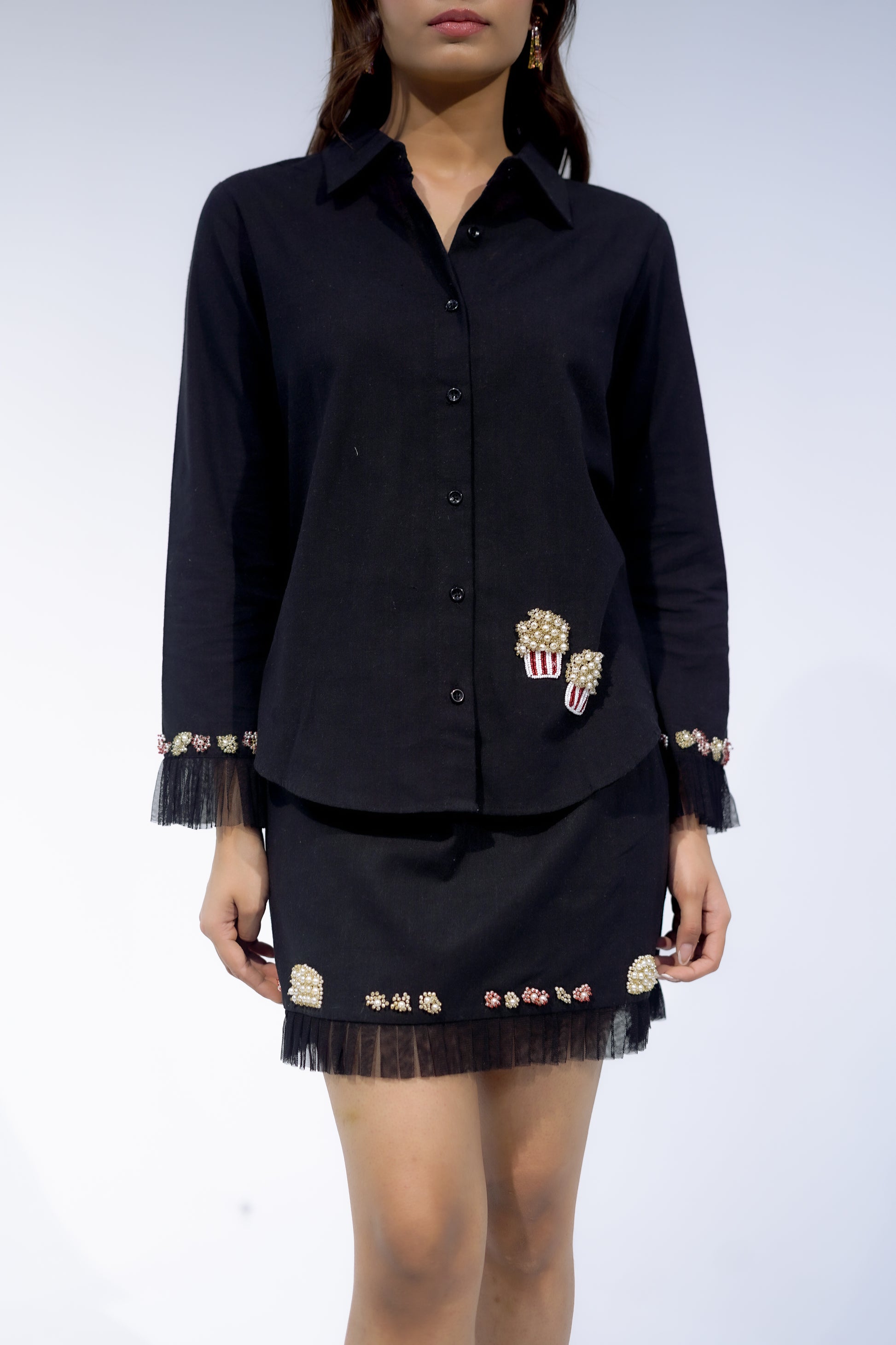 Looking for something Cute, Catchy and Quirky ? We have got you covered with our Popcorn Please shirt, that's totally hand embroidered and made with subtle frill detailing on the sleeves. Best Paired with our Popcorn Please skirt or Pop up Pants