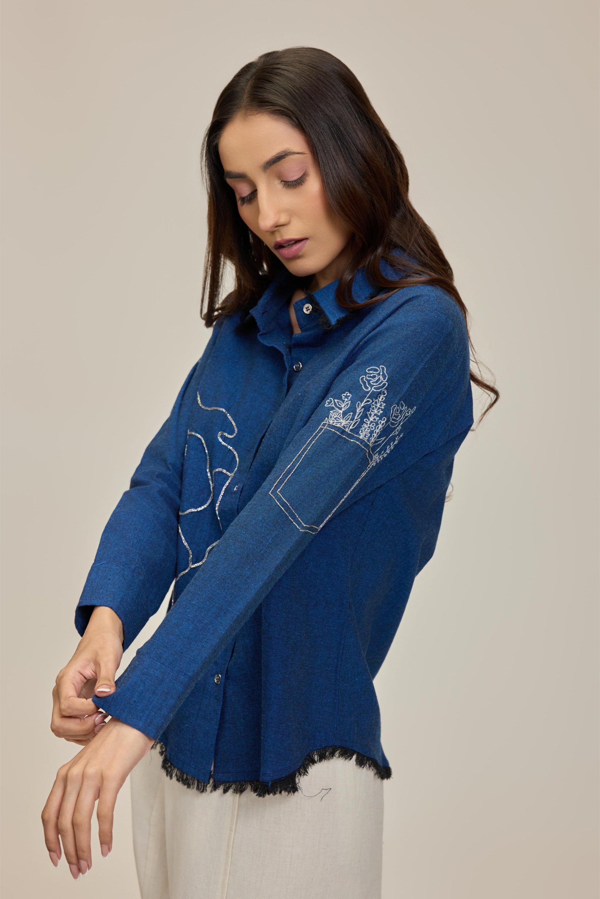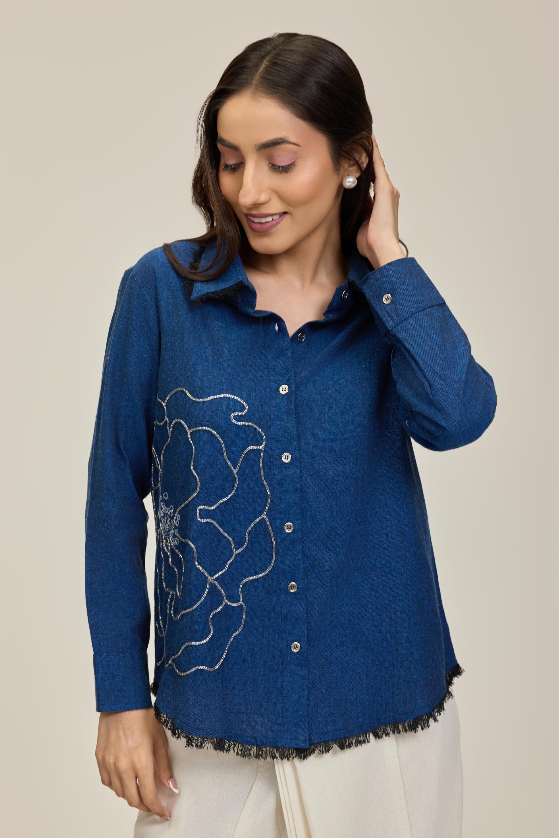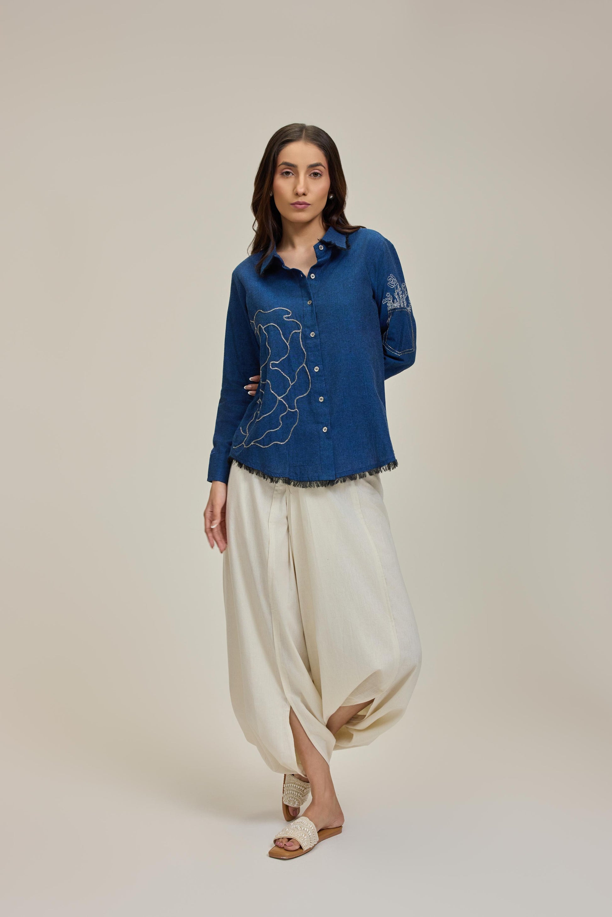 Elevate your wardrobe with this exquisite ivory hand-embroidered shirt, a masterpiece of craftsmanship that seamlessly blends elegance and sophistication. Each delicate stitch tells a story of artistry, making it a timeless addition to any discerning fashionista's collection.