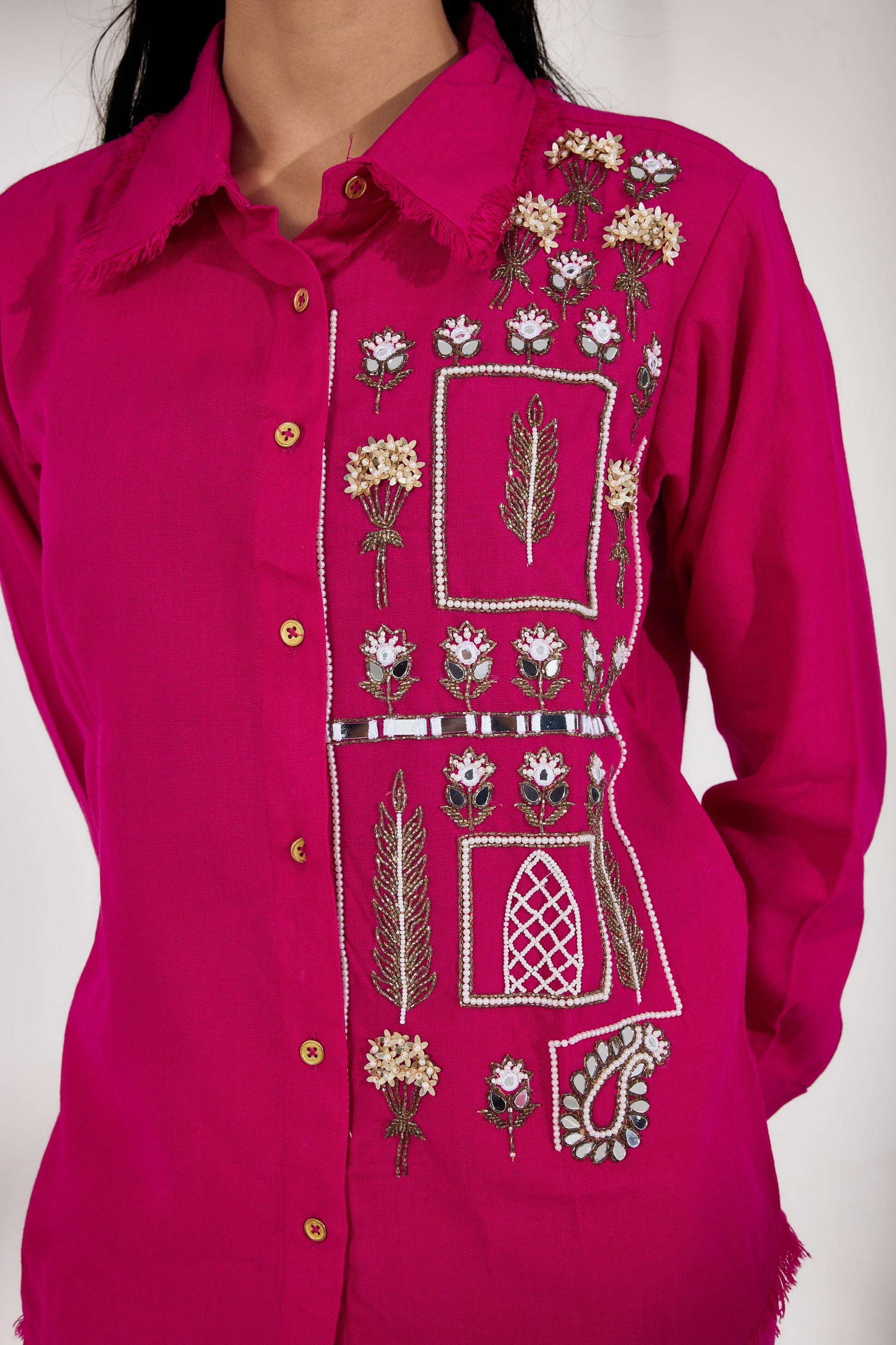 Elevate your wardrobe with our exquisite laal Sitara shirt, a stunning piece that showcases intricate hand embroidery adorned with delicate mirrors and cut beads. This shirt not only reflects elegance but also embodies the artistry of traditional craftsmanship. Perfectly paired with our Straight pants, this ensemble promises to make a bold statement at any occasion.