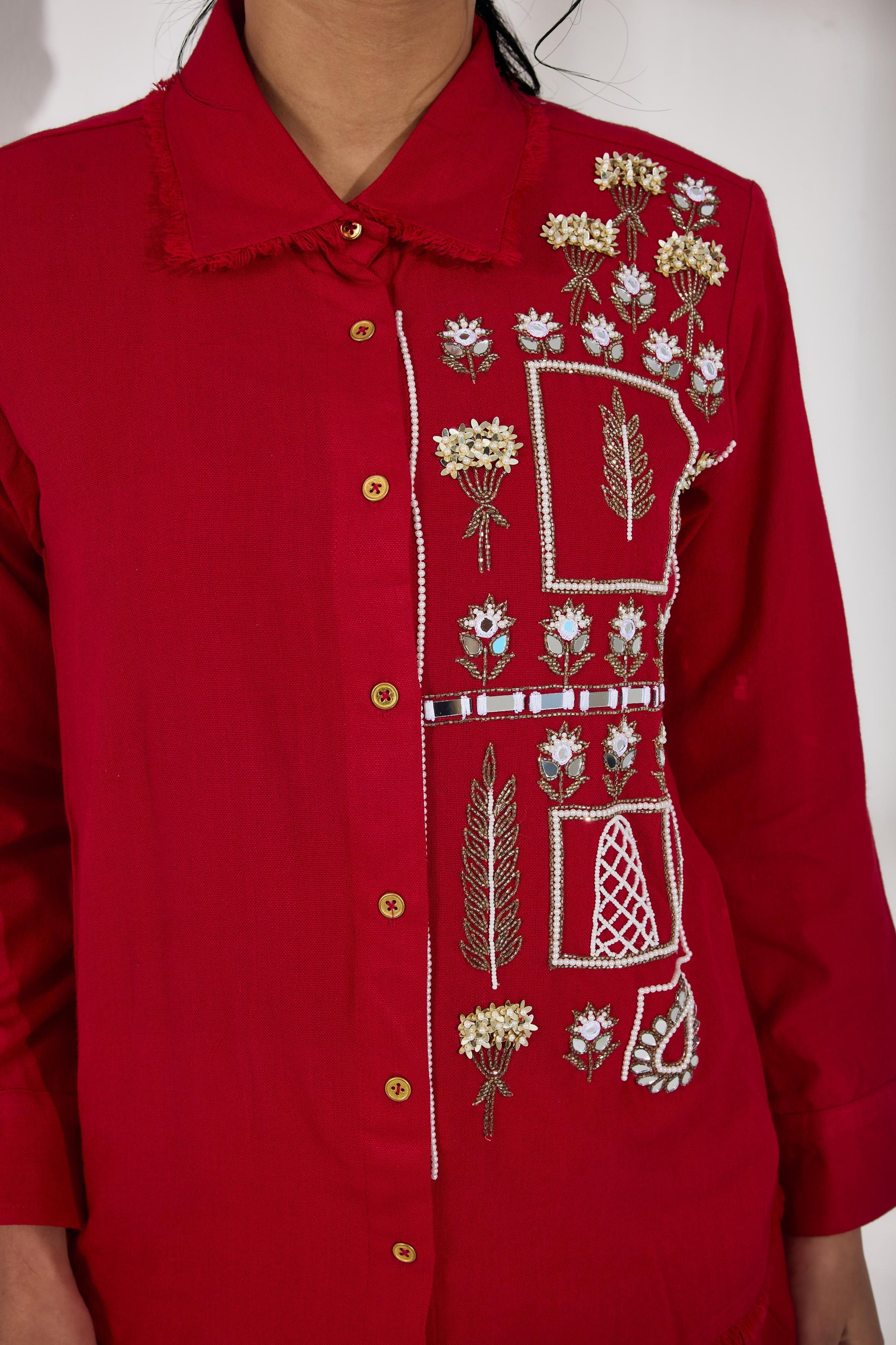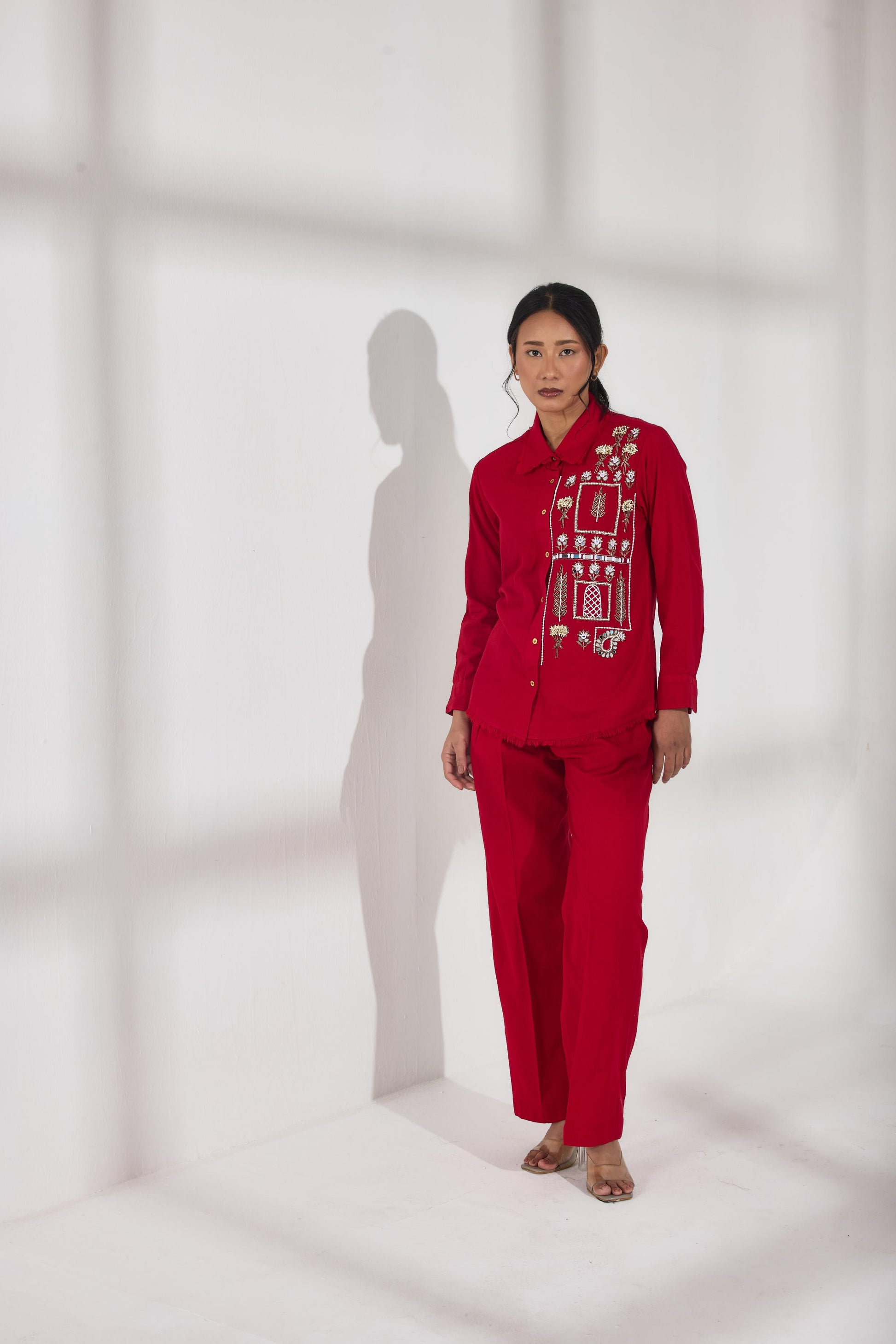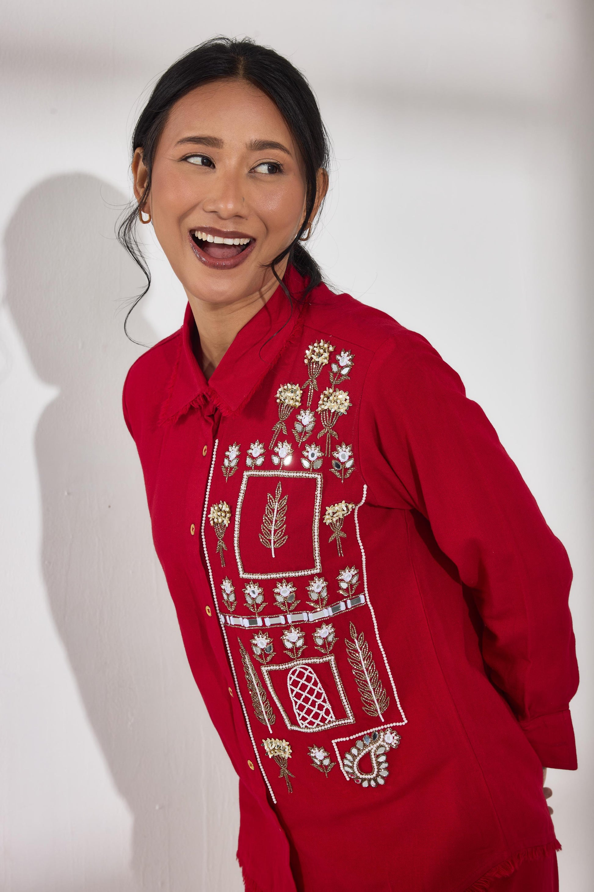 Elevate your wardrobe with our exquisite laal Sitara shirt, a stunning piece that showcases intricate hand embroidery adorned with delicate mirrors and cut beads. This shirt not only reflects elegance but also embodies the artistry of traditional craftsmanship. Perfectly paired with our Straight pants, this ensemble promises to make a bold statement at any occasion.
