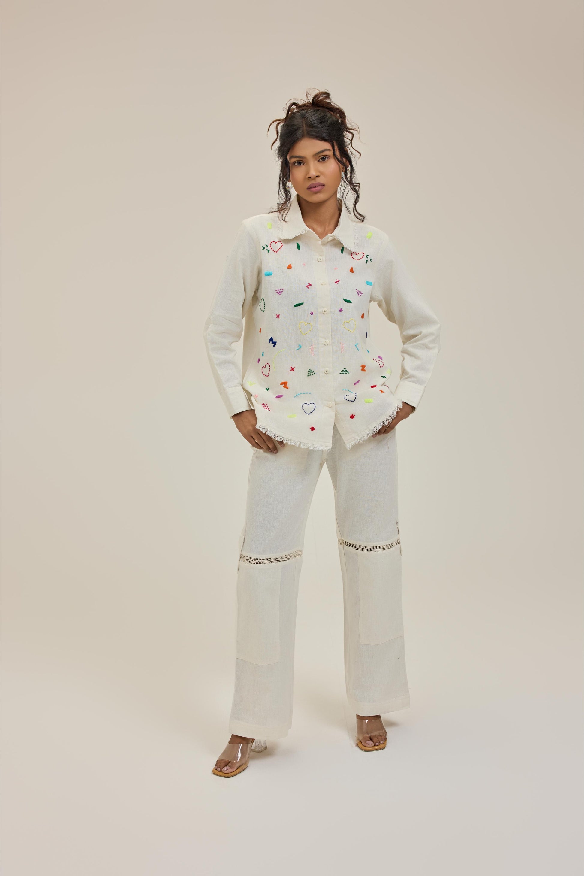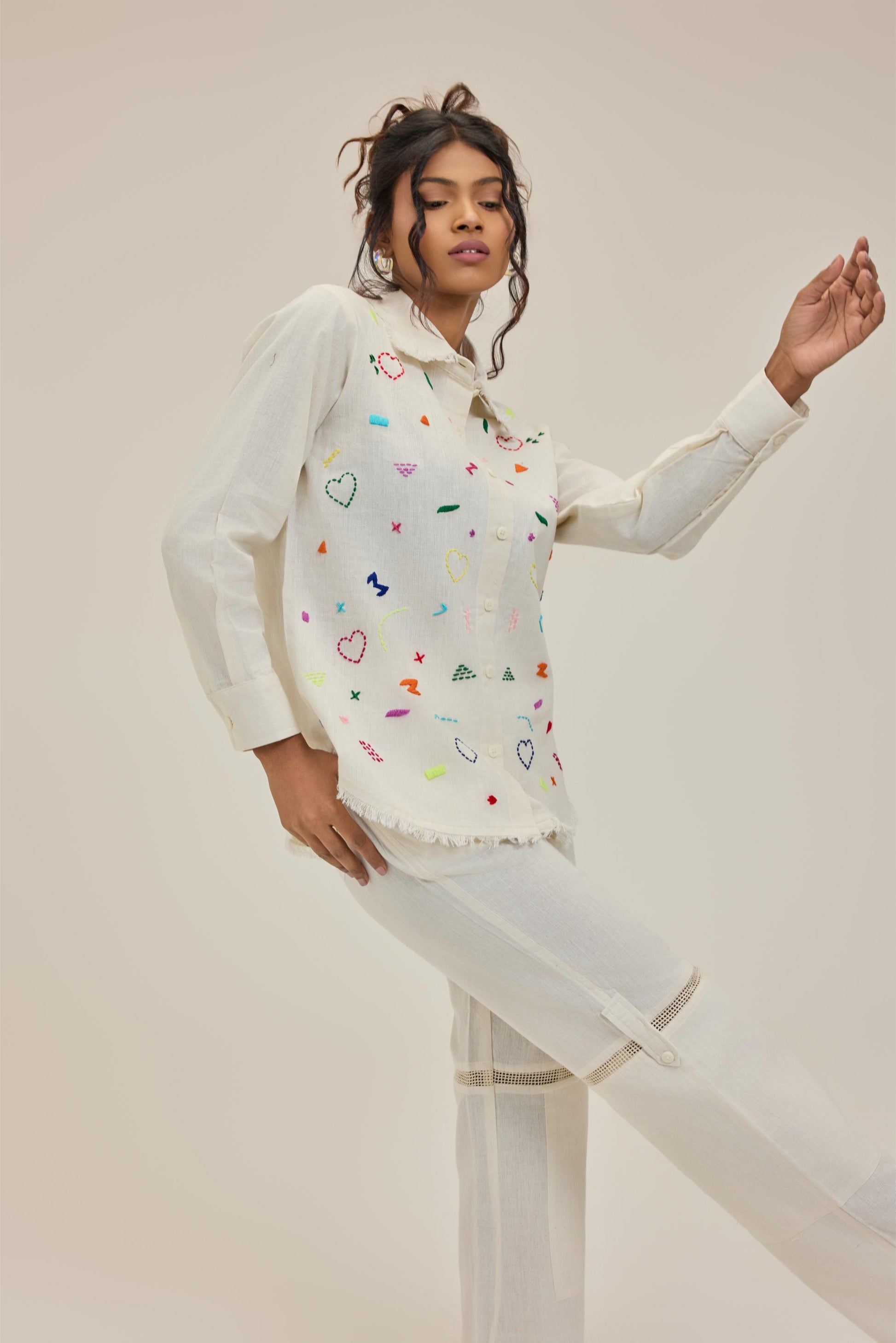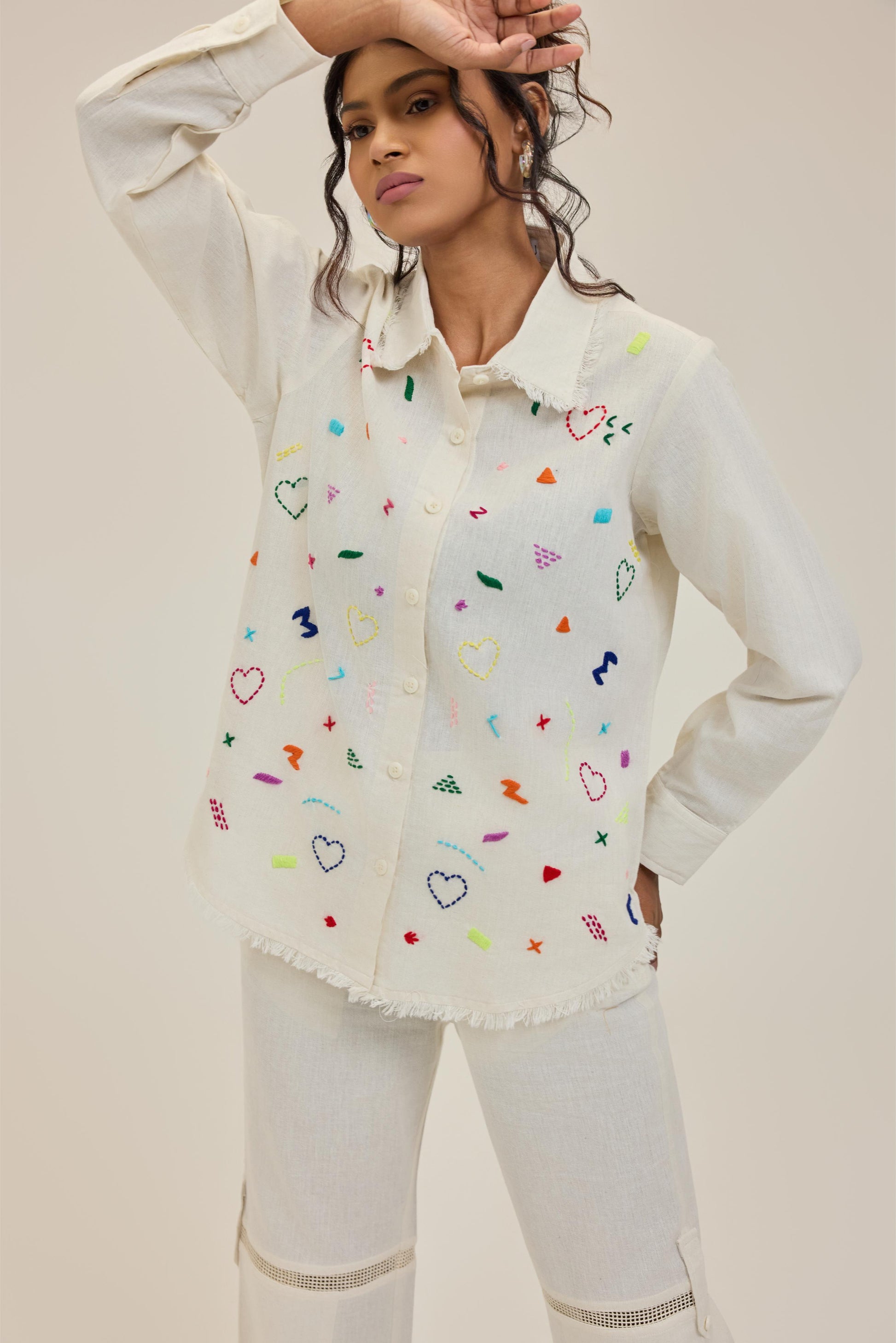 Check out this stylish white Doodle shirt, perfect for adding a unique touch to your wardrobe! Each shirt is hand-embroidered, showcasing intricate designs that make it stand out. It's not just a shirt; it's a statement piece that combines comfort with creativity.